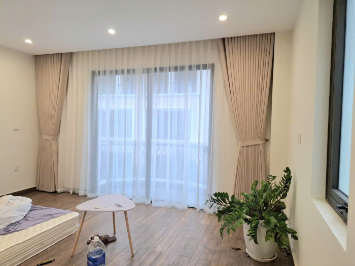 Toàn bộ rèm được thi công theo phong cách ẩn thanh ray âm trần, giúp không gian trở nên liền mạch, cao thoáng và tối giản đúng tinh thần kiến trúc hiện đại.